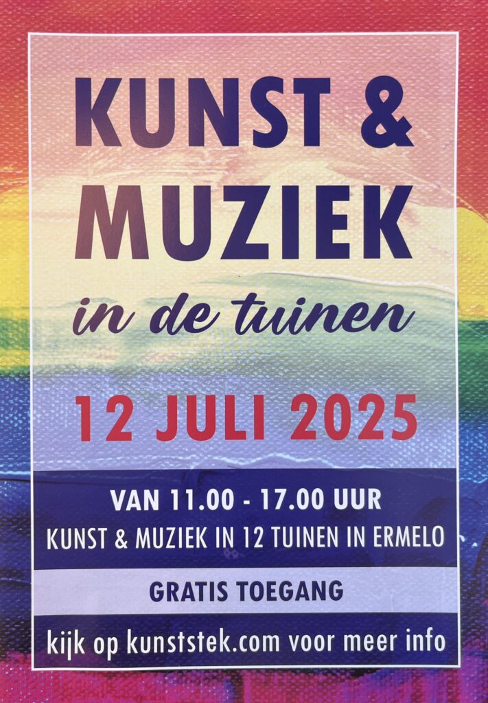 In 12 tuinen in en rondom Ermelo en in de Kunstgalerie StEK wordt van 11.00 – 17.00 uur een gevarieerd programma van levende muziek aangeboden en worden door ruim 30 kunstenaars een variëteit aan kunstwerken getoond. De kunstwerken bestaan uit en variëteit aan schilderijen, beelden, tekeningen, etsen, papierkunst, foto’s, textielkunst, glasfusion, keramiek en beschilderd porselein. De tuinen zijn deze dag vrij toegankelijk. De Kunstgalerie StEK aan de Stationstraat 72A is altijd van dinsdag tot zaterdag tussen 11.00 en 17.00 uur open. Een overzicht van de locaties, kunstenaars en musici is gratis in de galerie af te halen.